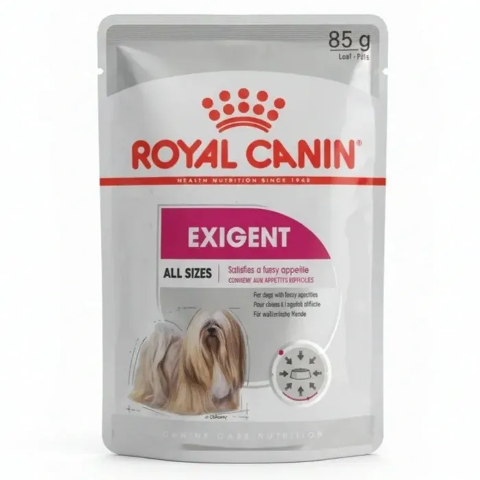 پوچ سگ رویال کنین اگزیجنت ۸۵ گرم (Royal Canin Exigent Wet Food 85g) مخصوص سگهایی طراحی شده است که نسبت به طعم و بافت غذا حساس هستند و معمولاً بهسختی غذا میخورند.