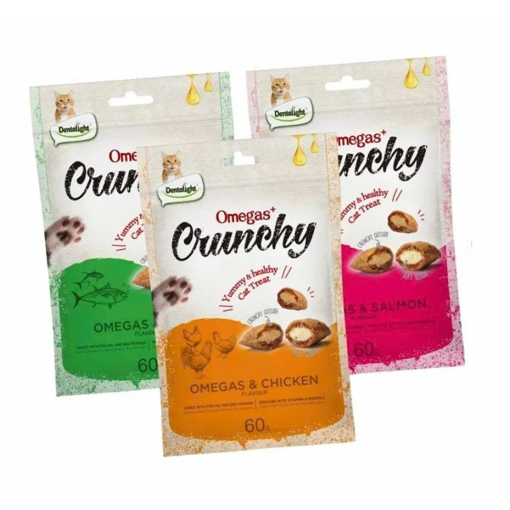 تشویقی Dentalight Omegas+ Crunchy Biscuit Stuffed 60 g یک میانوعده خوشمزه و مغذی مخصوص گربههاست که در سه طعم ماهی سالمون، ماهی تن و مرغ عرضه میشود. این تشویقی با طراحی بیسکوییت مغزدار، لایه بیرونی ترد و مرکز نرم دارد که جویدن و لیس زدن را برای گربه لذتبخش میکند.